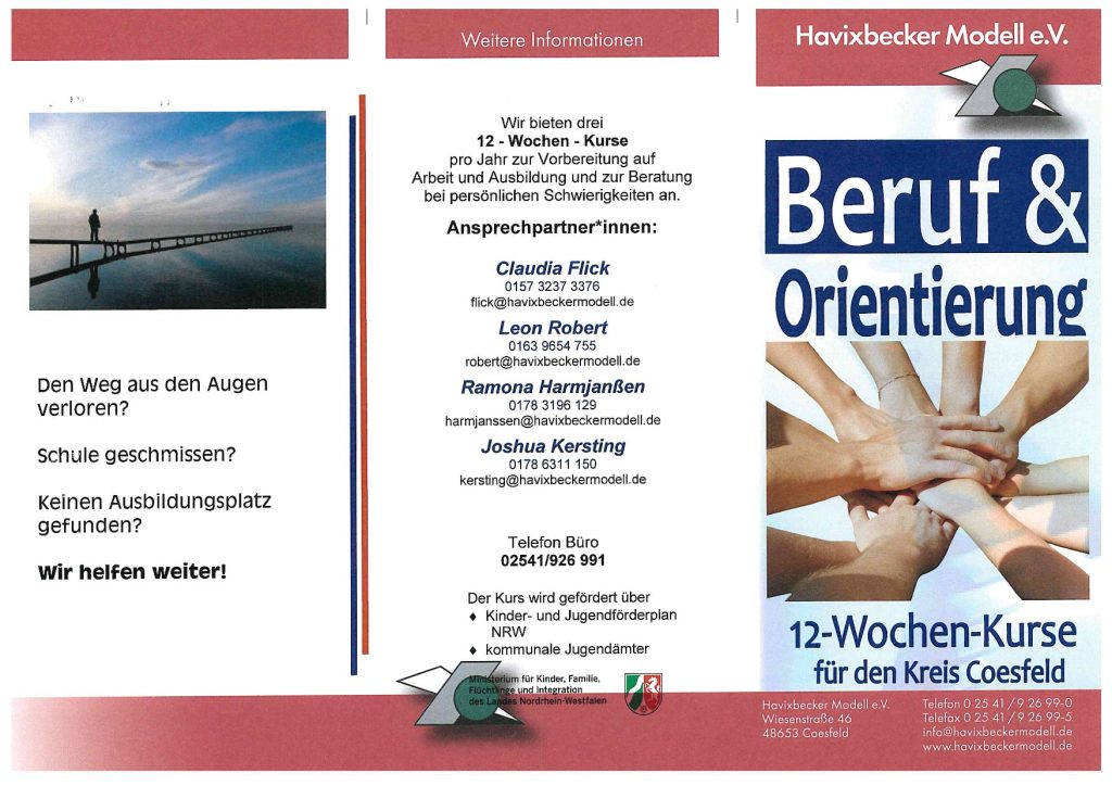 Dreimal jährlich wird ein Kurs zur Berufsorientierung und Motivierung durchgeführt. Ein Kurs umfasst 12 Wochen, wobei die Teilnehmenden fließend einsteigen können. Das Kernstück, in dem alle Kursteilnehmer*innen gleichzeitig dabei sind, dauert sechs Wochen und umfasst die Betreuungstage und das Betriebspraktikum. Der Beginn dieser Kernstücke liegt jeweils Anfang Februar, Anfang Juni und Anfang Oktober. Der Einstieg in den Kurs ist jederzeit vor den Gruppeneinheiten möglich. Der vierwöchige Praxisblock beinhaltet drei Praktikumstage pro Woche in einem entsprechenden heimatnahen Betrieb und zwei sozialpädagogisch betreute Gruppentage -einschließlich Übernachtung- in Coesfeld.